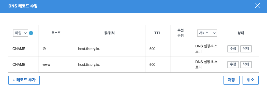 내 도메인 host에 @, 값/위치에 host.tistory.io 를 입력하여 내 도메인이 host.tistory.io. 를 바라보도록 설정합니다.