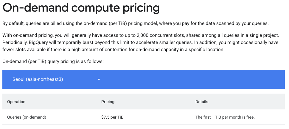 - BigQuery 가격 책정 > 주문형 컴퓨팅 가격 책정 : https://cloud.google.com/bigquery/pricing#on_demand_pricing
