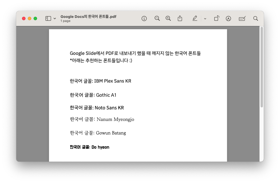 [문자: 한국어]로 필터링했을 때 나오는 글꼴로 한국어를 입력하고 PDF로 출력하면 글꼴이 정상적으로 나오는 것을 확인할 수 있습니다.