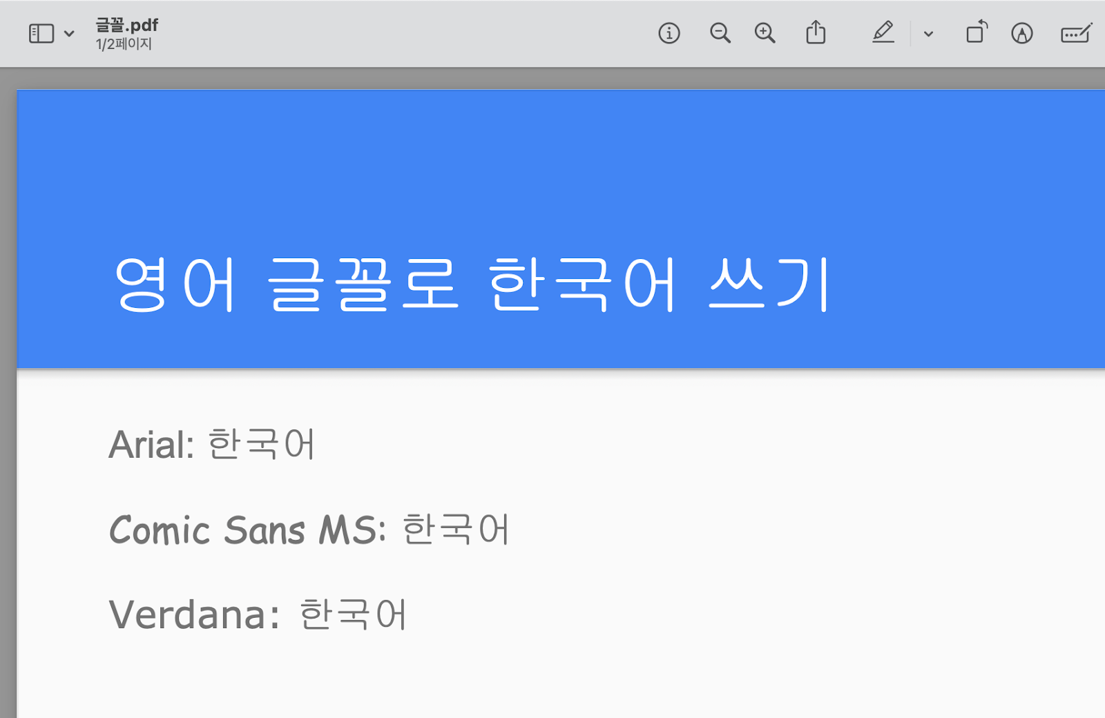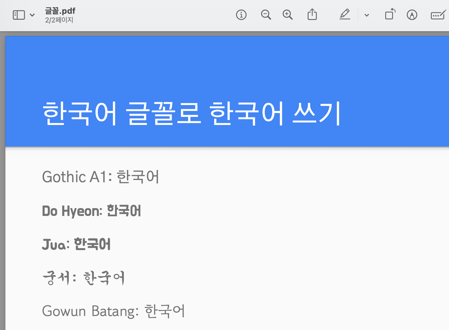 [문자: 한국어]로 필터링했을 때 나오는 글꼴로 한국어를 입력하고 PDF로 출력하면 글꼴이 정상적으로 나오는 것을 확인할 수 있습니다.