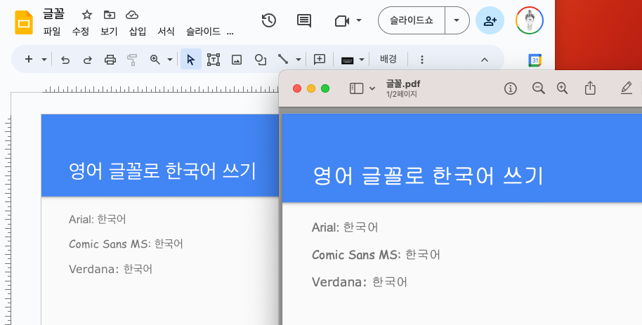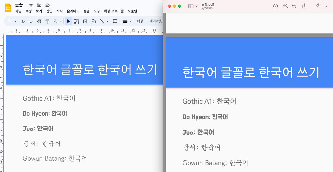 왼쪽은 Google Slide, 오른쪽은 내보내기한 PDF 파일입니다.