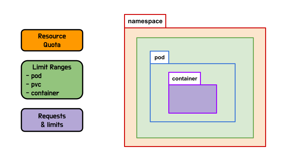 Resource Quota, Limit Ranges, Requests&Limit 가 영향끼치는 범위를 연한 색깔로 나타내면 다음과 같다.