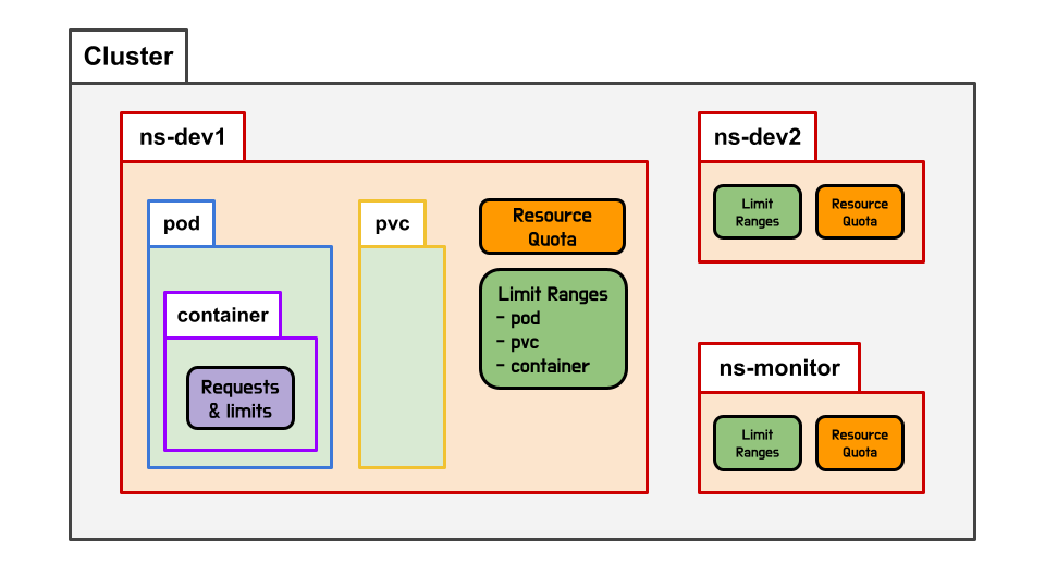 Resource Quota, Limit Ranges, Requests&Limit 가 영향끼치는 범위를 연한 색깔로 나타내면 다음과 같다.