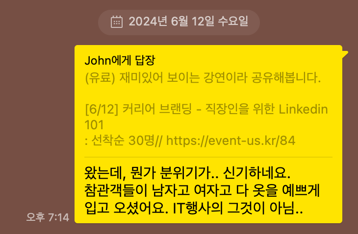 최근에 John님이 알려주신 덕분에 링크드인 세미나에 다녀왔습니다.