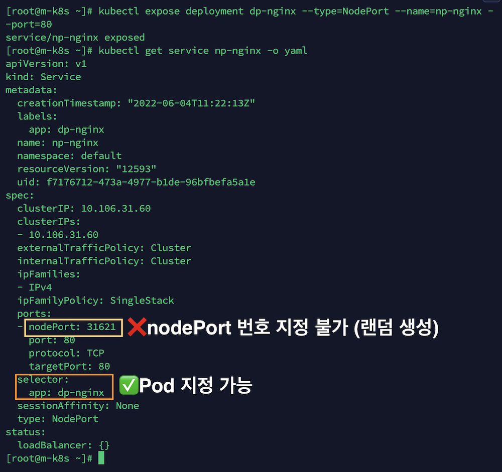 노드포트를 expose로 생성하면 Pod는 지정할 수 있으나, 노드포트 번호는 지정할 수 없다.(랜덤 생성)