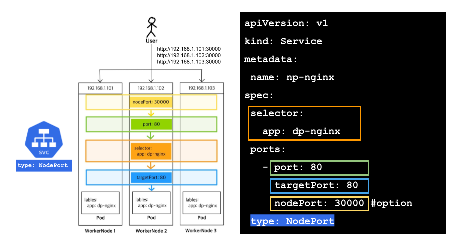 노드포트를 yaml로 생성하면 spec.ports.nodePort로 노드포트 번호를, spec.selector로 Pod를 지정할 수 있다