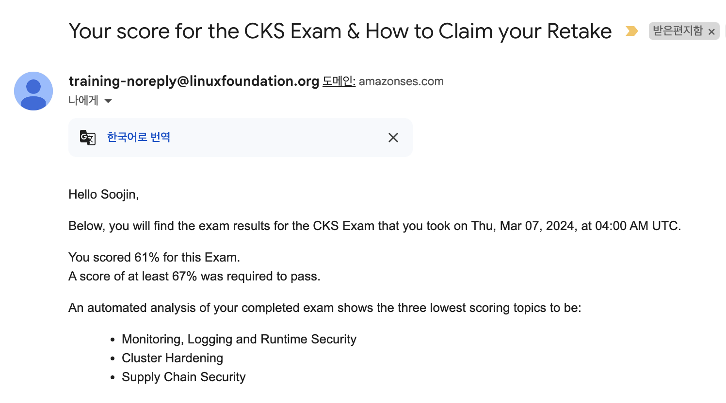 쿠버네티스 시험은 시험 종료 후 24시간 이내로 My Portal에 결과가 나오고 곧 합격 여부를 알리는 메일이 옵니다.