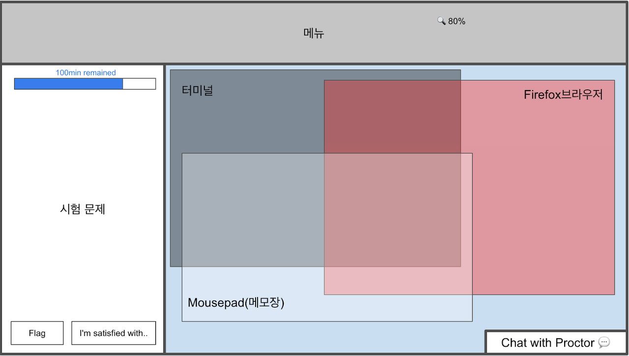 저는 평소 컴퓨터 할 때처럼 창을 아래처럼 겹쳐서 두고(사유: 창 간 전환 빠르게 하려고), PSI브라우저를 zoom out하고, 터미널 폰트를 작게 하는 방식으로 시험을 봤었습니다.
