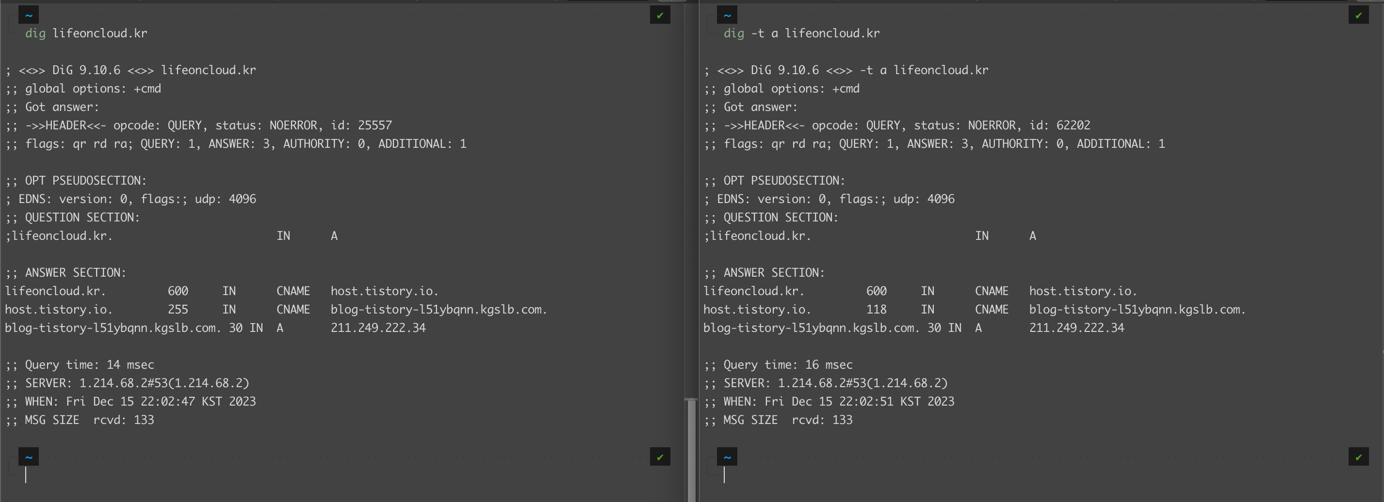 분명 질문 섹션에는 A레코드만 있는데 응답에 CNAME레코드가 나오는 이유는 제가 티스토리 블로그에 개인 도메인을 설정하려고 DNS 설정에 CNAME레코드를 추가했기 때문입니다.