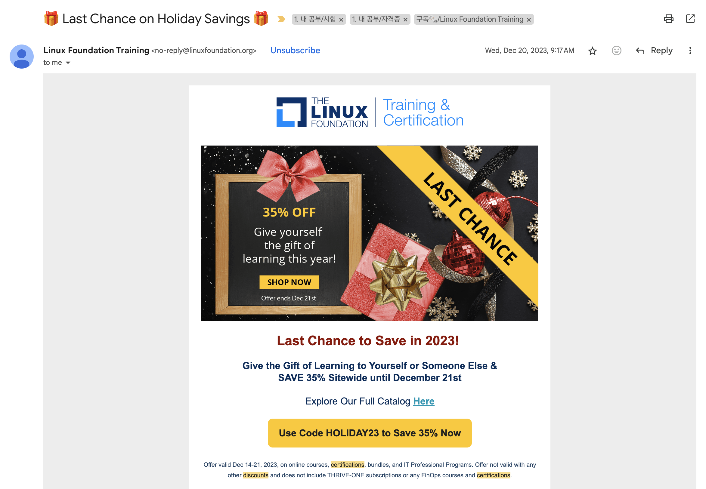2022년 사이버먼데이 프로모션 페이지(지금은 종료): https://training.linuxfoundation.org/cm22/