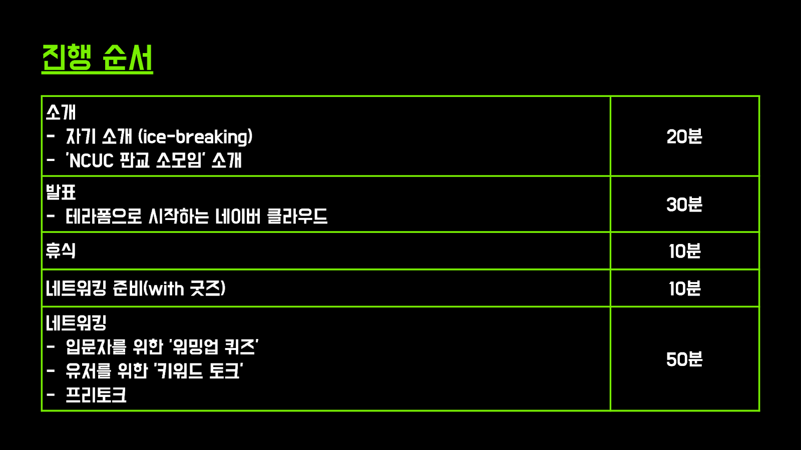 행사 진행 순서는 기존 네이버 클라우드 행사 순서를 따르되, 후반부 네트워킹에 힘을 주었습니다(!)