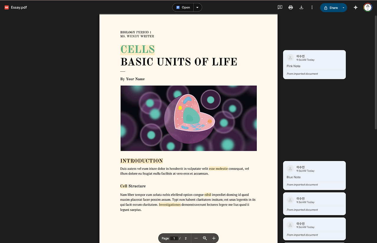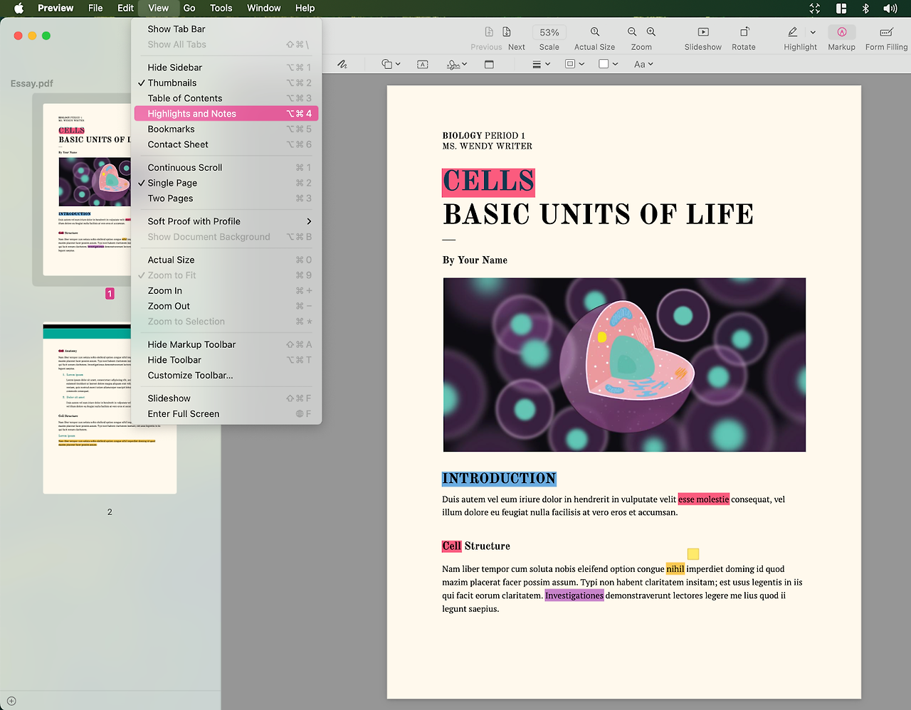 1. [View > Highlights and Notes] 메뉴를 클릭하면, 하이라이트와 메모들을 한눈에 모아 볼 수 있습니다.