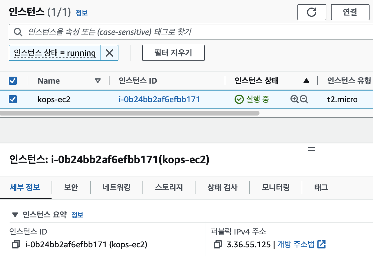 kops-ec2 인스턴스가 생성된 걸 확인하면 로컬에서 터미널로 kops-ec2 인스턴스에 접속해보자.