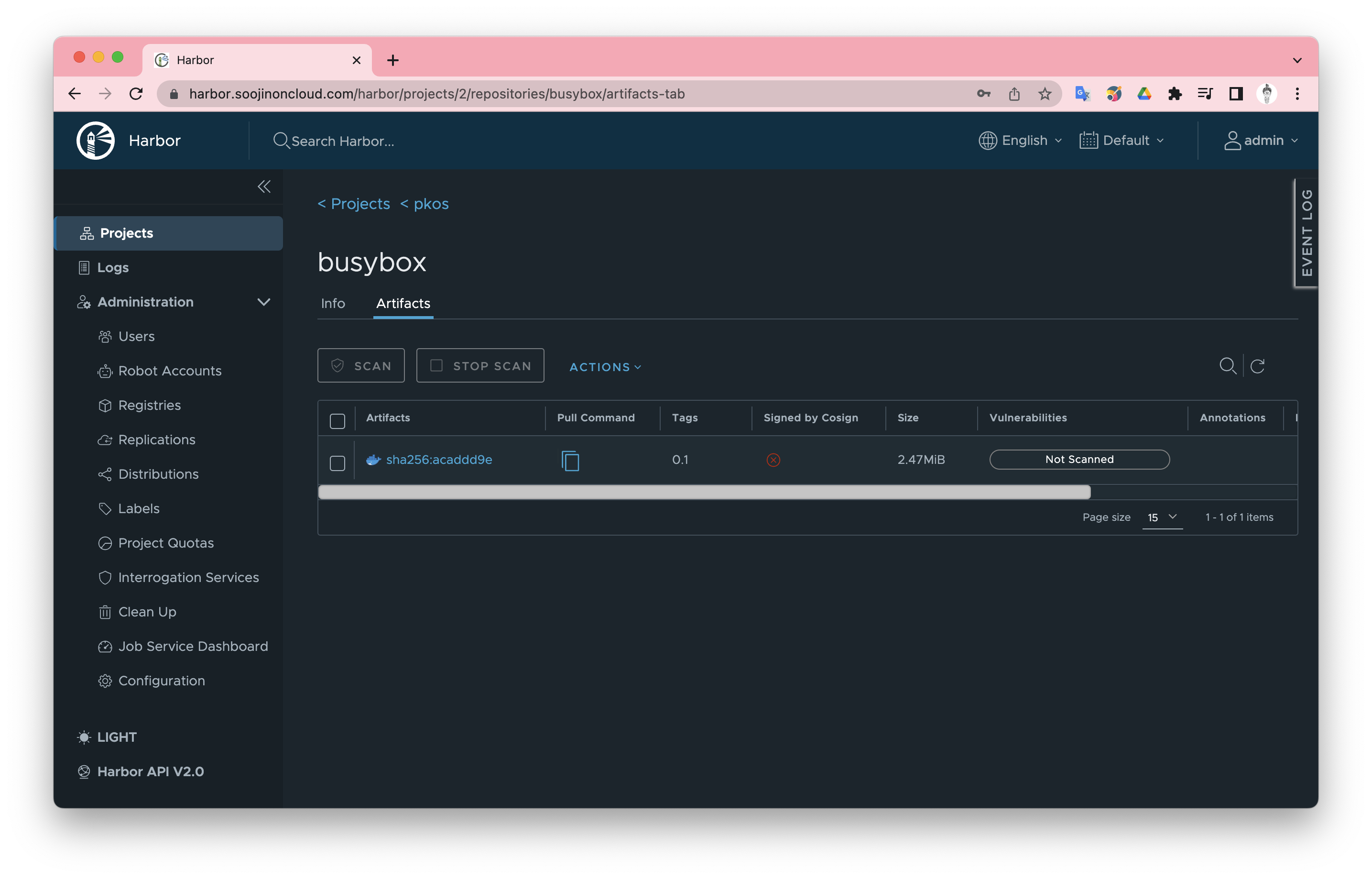 이미지 push 후, harbor 웹UI에서 이미지 업로드와동시에 취약점 검사가 같이 진행되는 것을 볼 수 있다.