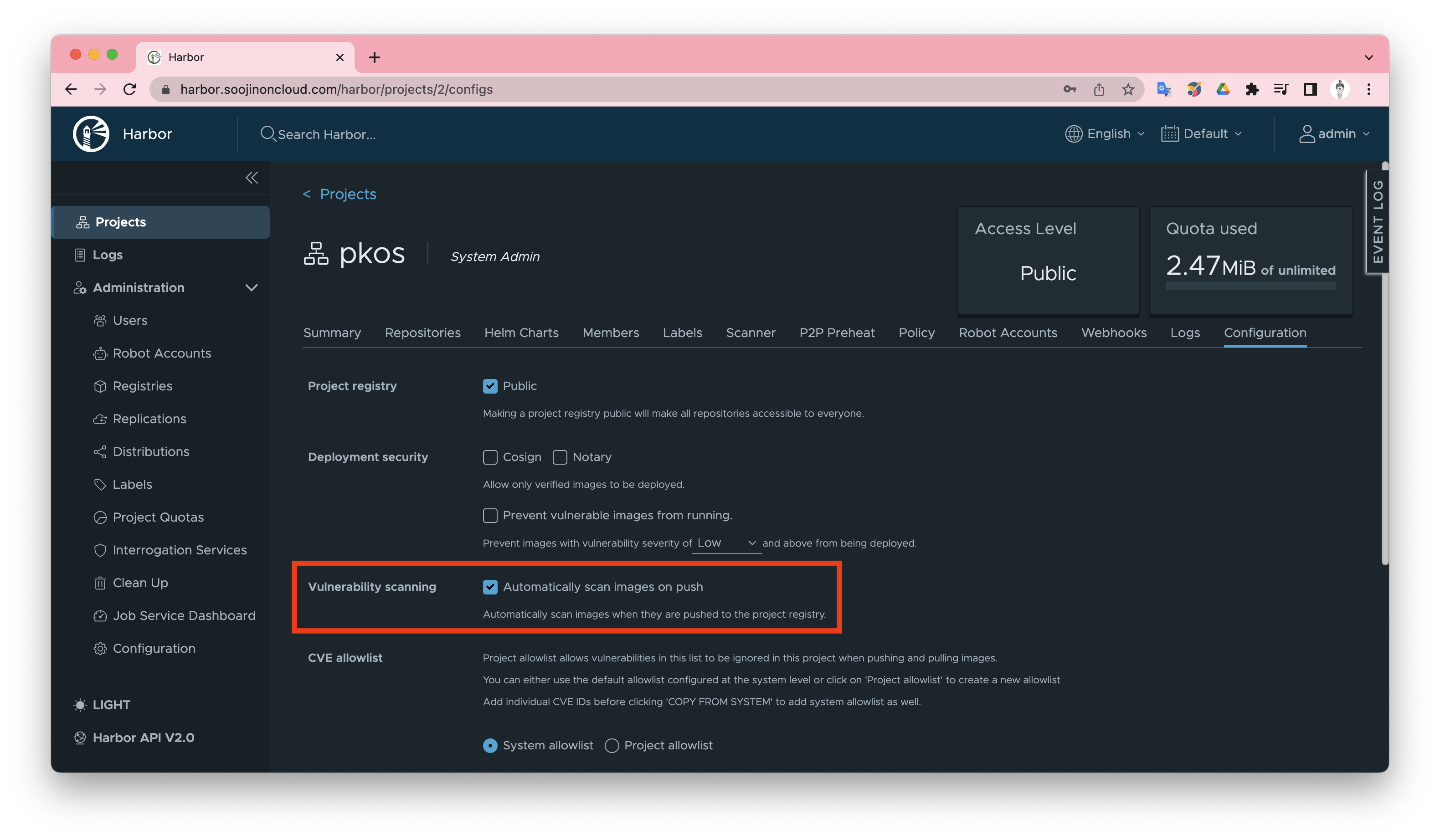 Harbor는 이미지 취약점 스캐닝 기능도 제공하고 있다.