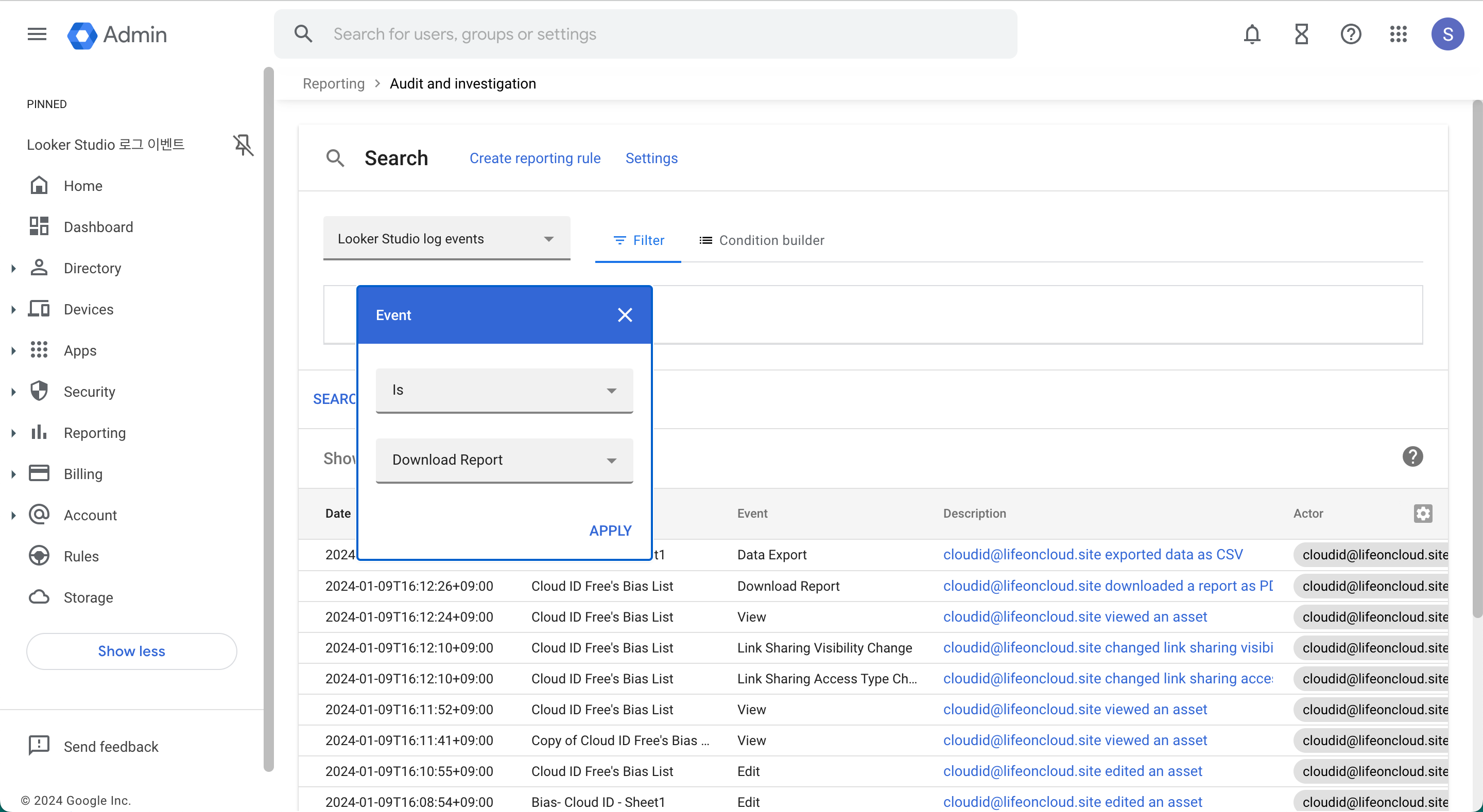 Google Workspace 뿐 아니라 Cloud ID 사용자 계정의 Looker Studio 로그도 동일한 방법으로 확인할 수 있습니다.