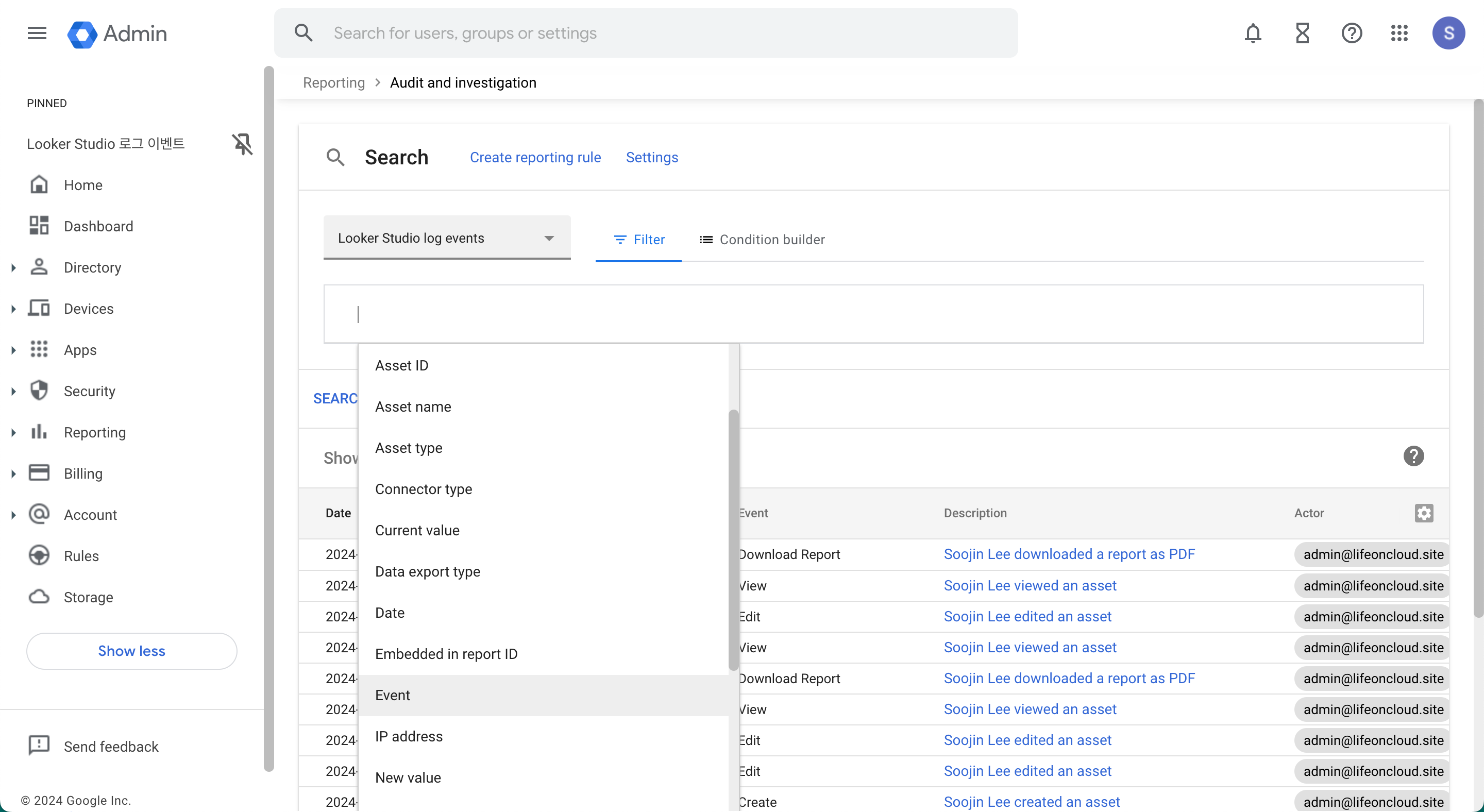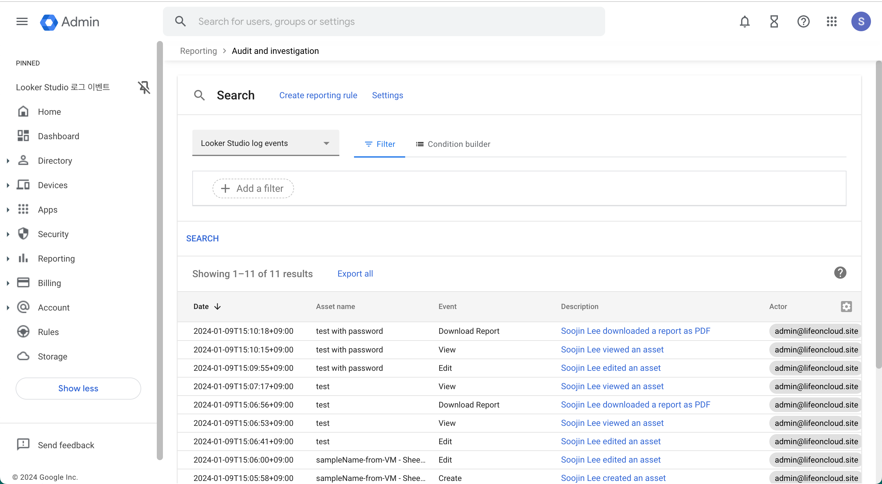- 관리 콘솔 > 보고서 > 감사 및 조사 > Looker Studio 로그 이벤트
