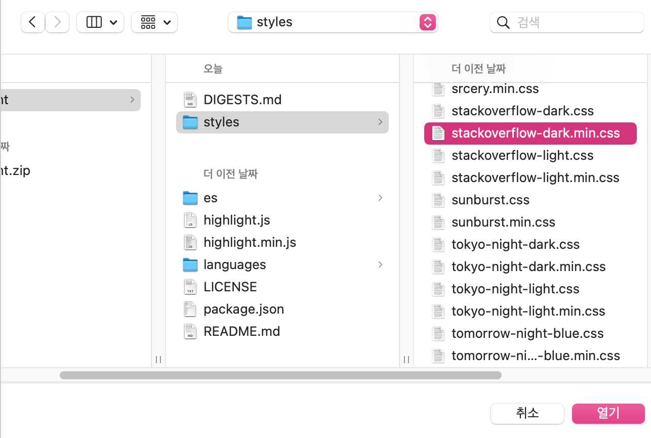 저는 stackoverflow-dark.min.css 를 골랐습니다.