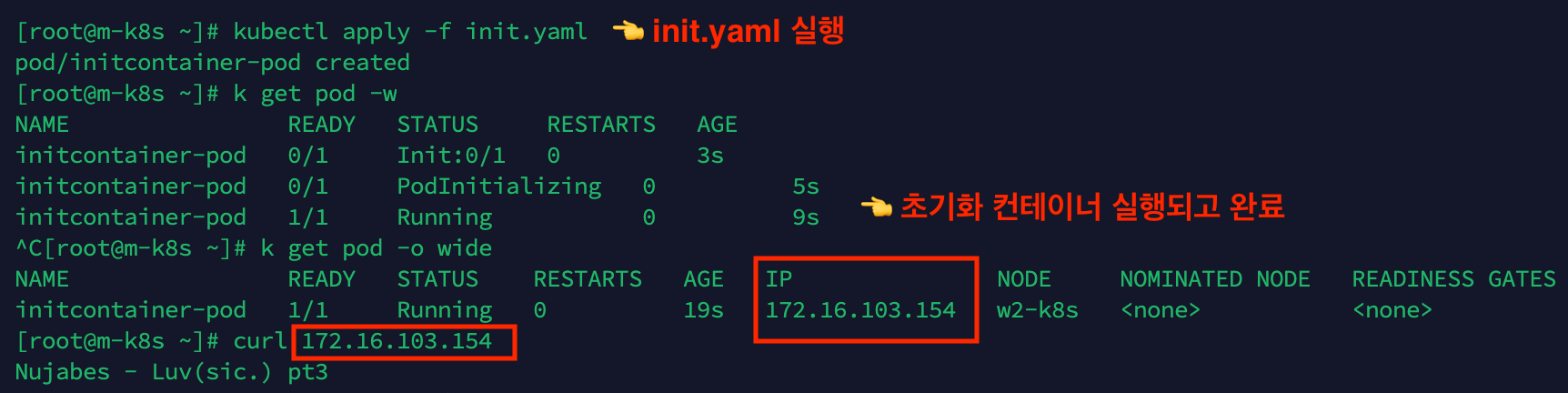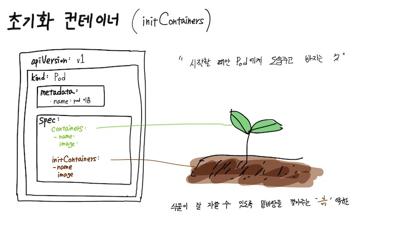 - 컨테이너를 initContainers로 지정하기 위해서는, PodSpec에 initContainers항목을 containers항목과 동일한 레벨에 지정한다 (containers 항목 하위에 명세 지정x)