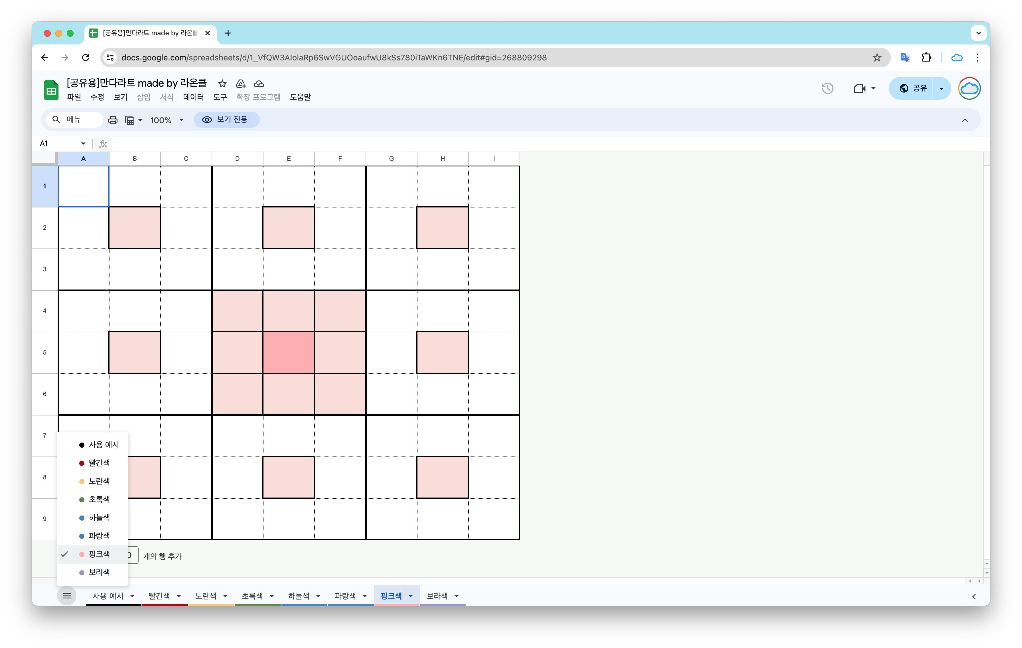 현재 빨간색, 노란색, 초록색, 하늘색, 파랑색, 핑크색, 보라색 만다라트 탭을 만들어두었습니다.
