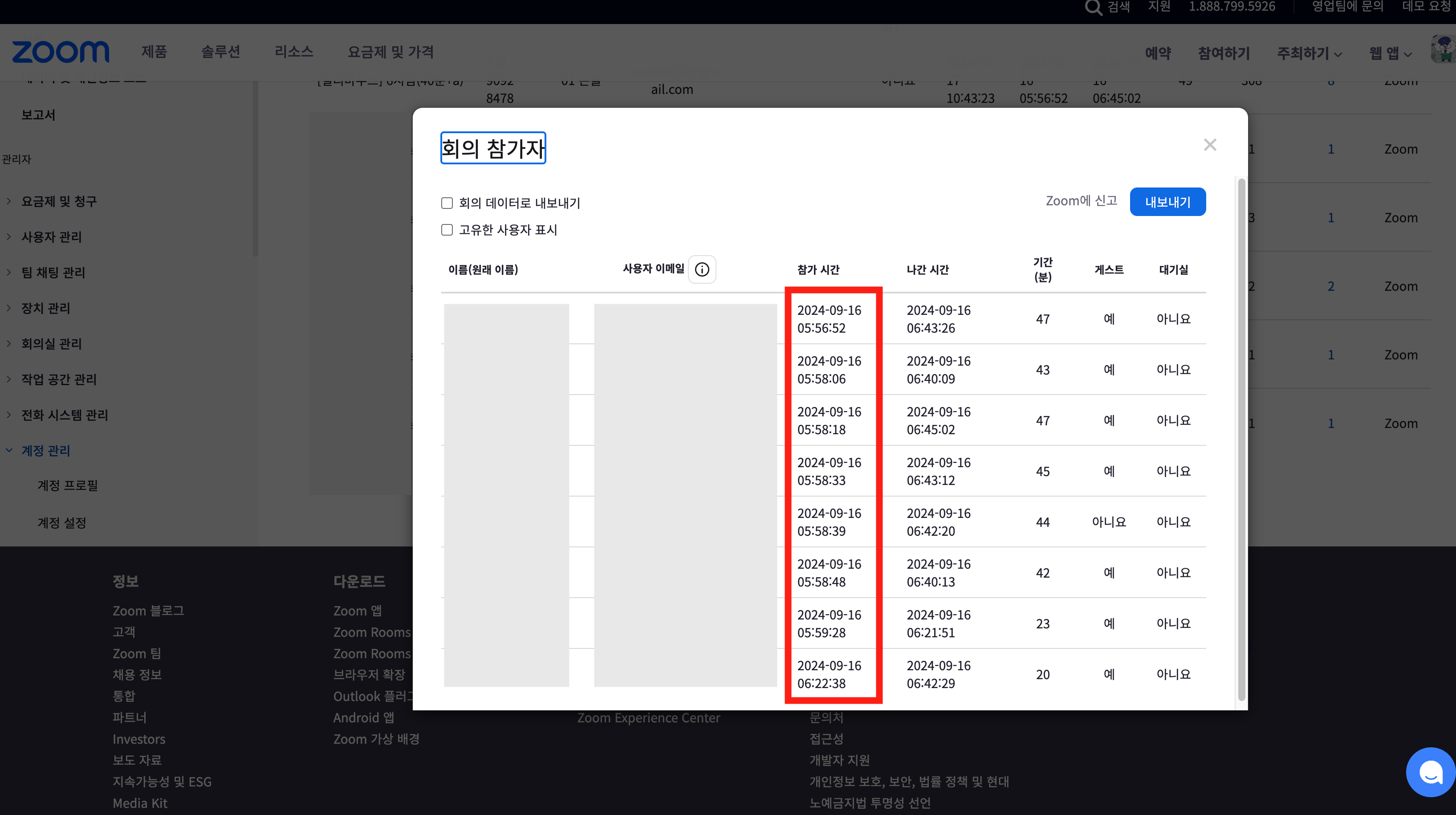 줌 회의 호스트의 관리자 메뉴에서 누가 몇분에 들어왔는지 확인할 수 있습니다.